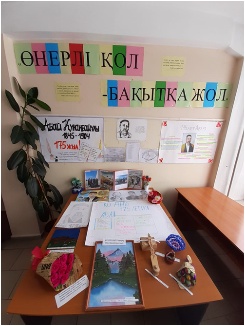 College students took an active part in organizing the exhibition. They brought the items that they had made themselves: a wooden box, a cauldron, bouquets of paper, bracelets of yarn, crockery made of beads, and much more. According to the results of the exhibition, the first place was taken by Kambar Ainaz, he painted a portrait of the poet. The second place was taken by Gusev Vladislav, who had written the poem “Abai Kunanbayev.” The third place was taken by Erkinkyzy Moldir, who had drown a picture called “Табиғат байлығы”.