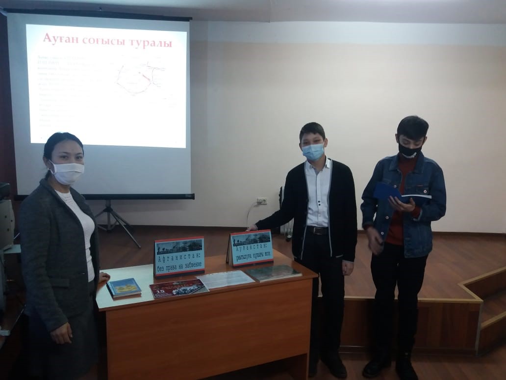 1989 жылы, ақпан айының 15- ші жұлдызында талай аналарды перзенттерінен айырған, мыңдаған жерлес бауырларымыз қаза тапқан, қасіретті де қайғылы Ауған соғысы аяқталды. Оқушыларға Ауған соғысының аяқталуының 32 жыл төңірегі жөнінде көптеген мәліметтер айтылып, талқыланып, аяғы қызықты да қайғылы сұрақ – жауап арқылы естелік әңгімелермен жалғасты.