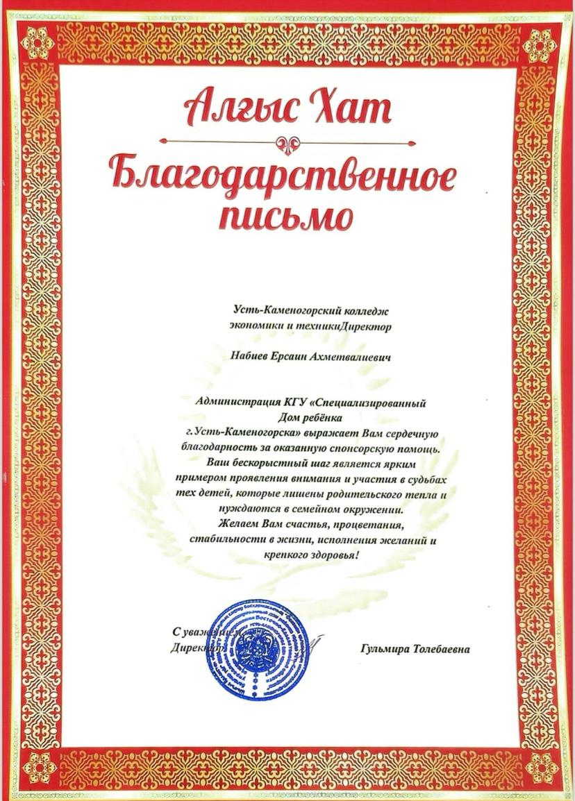 Өскемен қаласындағы «Мамандандырылған балалар үйінің» КММ әкімшілігі Өскемен экономика және техника колледжінің директоры Набиев Ерсайын Ахметуәлиұлына демеушілік көмек көрсеткені үшін алғыс хат табыс етті. Наурыз мейрамы қарсаңында колледж ұжымы балалар үйіне барып, тәрбиеленушілерге қажетті заттар мен азық-түлік жеткізді. Бұл игі іс қамқорлық пен жанашырлықтың айқын көрінісі болды.
