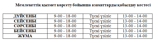 | Азаматтарды қабылдауды жүргізетін тұлға аты-жөні | Лауазымы | Қабылдау уақыты | Орналасқан жері | Байланыс телефондары |