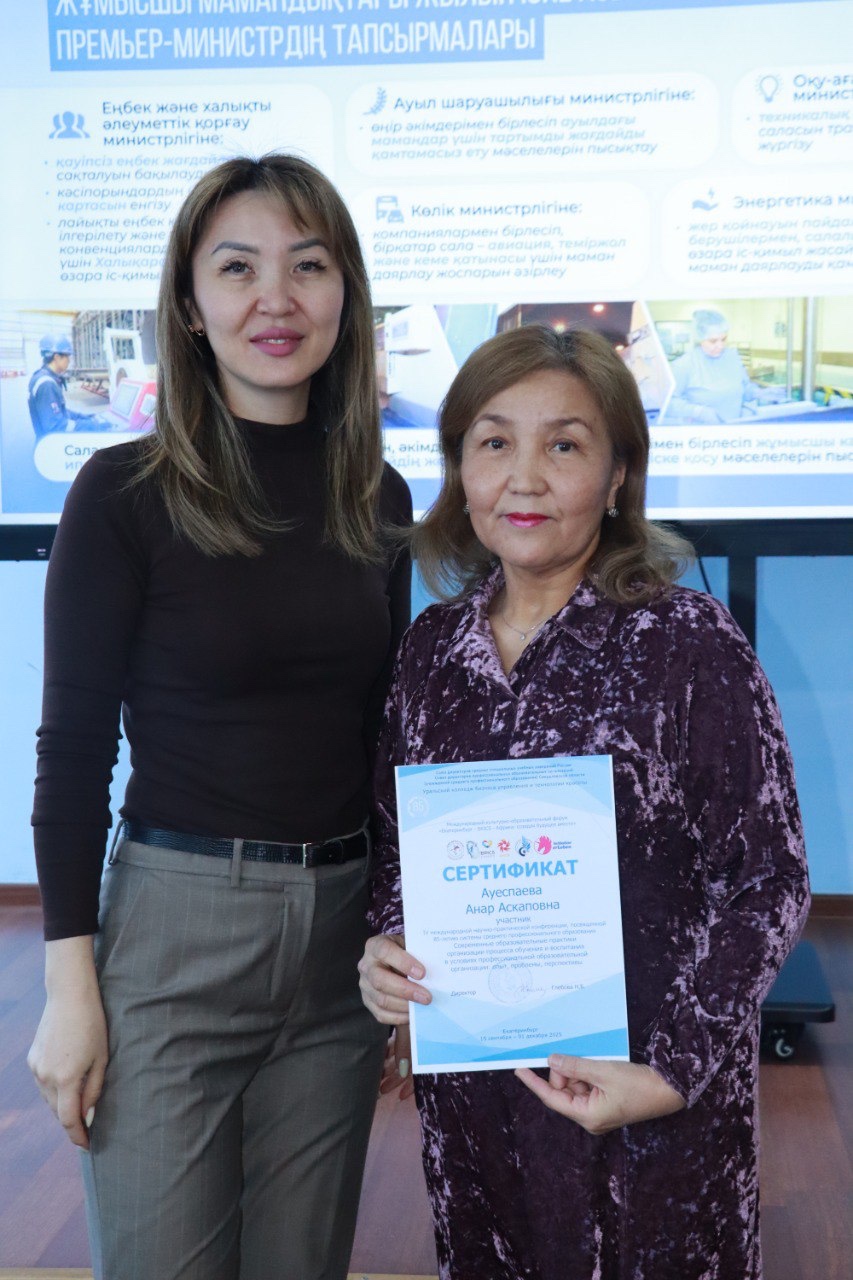 Алынған Алғыс хат Өскемен экономика және техника колледжінің ғылыми-білім беру жобаларына белсенді қатысуын растайды және педагогикалық құрамның жоғары кәсіби даярлығын айғақтайды.
