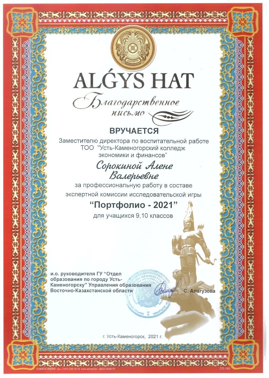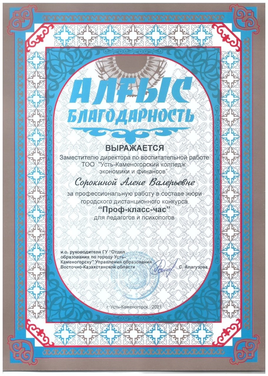 Өскемен қаласының білім бөлімі Өскемен экономика және қаржы колледжінің қызметкерлері Алена Валерьевна Сорокина мен Анар Аскаповна Ауеспаеваға, қалалық қашықтық байқауында мұғалімдер мен психологтарға арналған «Проф-класс-сағат» және 9, 10 сынып оқушыларына арналған «Портфолио 2021» зерттеу ойынында, сарапшылар ретінде кәсіби жұмыстары үшін алғыс білдірді.
