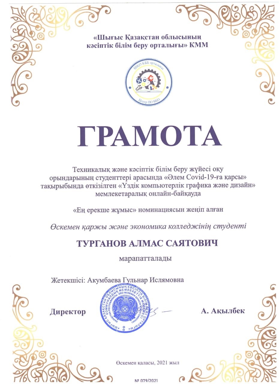 «Ақпараттық жүйелер» мамандығына мамандандырылған Өскемен экономика және қаржы колледжінің 1 курс студенті Тұрғанов Алмас, ТжКБ жүйесінің студенттері арасында «Әлем COVID-19-ға қарсы» тақырыбында «Ең ерекше жұмыс» номинациясымен, «Үздік компьютерлік графика және дизайн» мемлекетаралық онлайн-байқауында жеңіске жеткені үшін, Шығыс Қазақстан облысы кәсіптік білім беру орталығының дипломымен марапатталды. Ғылыми жетекшісі Акумбаева Гульнар Ислямовна.