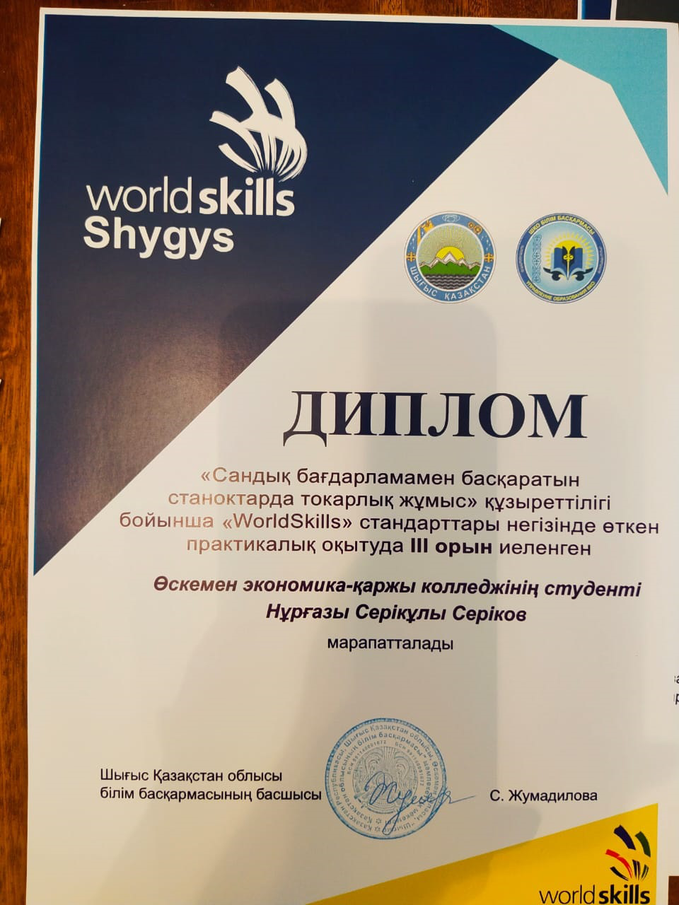 ӨЭжҚК студенттері «WorldSkills Shygys — 2020» V аймақтық чемпионатына қатысты. Біздің колледждің «Есептеу технологиясы және бағдарламалық қамтамасыздандыру» мамандығының түлегі Ткачманова Евгения «Бизнеске арналған IT шешімдер» құзыреті бойынша 2 орын алды, жетекшісі Т.М.Хомова «Сандық бағдарламамен басқарылатын станоктардағы токарлық жұмыс» құзыреті бойынша «Автокөліктерге техникалық қызмет көрсету, жөндеу және пайдалану» мамандығының 4 курс студенті Сериков Нұрғазы 3 орынға ие болды, жетекшісі Ш.К Сембина.