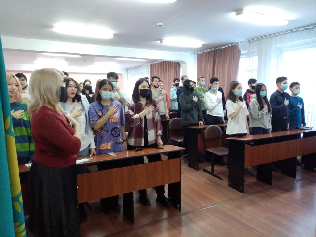 Сотрудники Центральной городской библиотеки имени Оралхана Бокея, побывали в нашем колледже с мероприятием «Менің Туым! Менің Елтаңбам! Менің Әнұраным!», посвященном 30-летию Государственных символов РК. Интерактивная презентация была представлена на казахском и русском языках, в ходе которой студенты приняли активное участие в обсуждении. Особое внимание было уделено истории создания Государственных символов Казахстана, трактовке их основных элементов. Встреча завершилась исполнением Государственного гимна.
