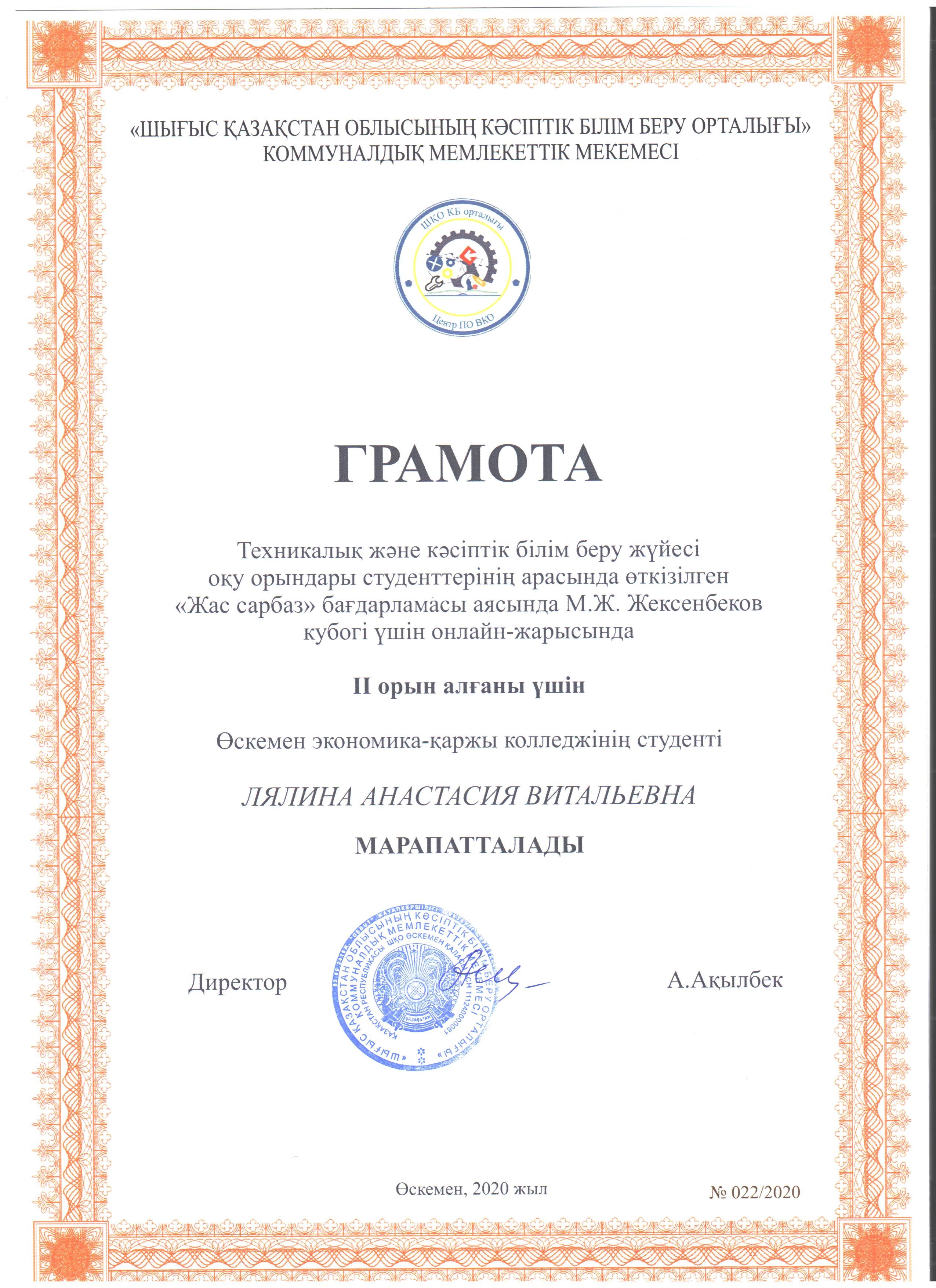 Студентка 1 курса Лялина Анастасия заняла почетное 2 место в VII областных дистанционных соревнованиях среди колледжей ВКО по начальной военной и технической подготовке на Кубок памяти Жексенбекова М.Ж. в рамках программы «Жас сарбаз». Руководитель – преподаватель Жумаканов Анатолий Имангалиевич.